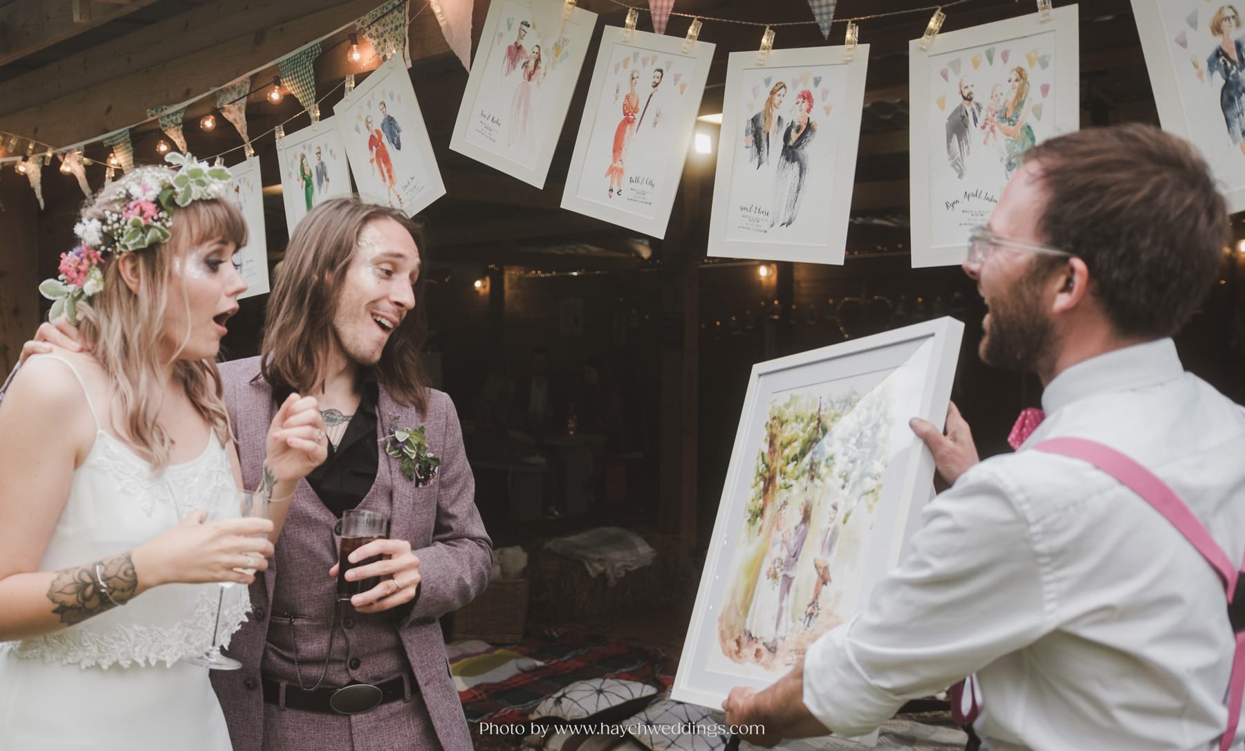 I’ll paint your guests while they are mingling – good times for this are in the post-ceremony lull while you are taking formal photos, and in the second longer lull after the wedding breakfast and speeches.